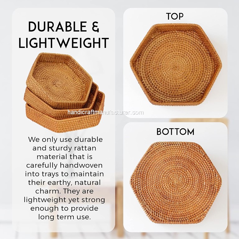 At Handicraft Manufacturer, We are dedicated to crafting a unique brand identity for your product. Our comprehensive services encompass design, mass production, sophisticated packaging, rigorous quality inspection, and seamless logistics. By handling every aspect of the process, we ensure your Hexagon Rattan Tray not only meets but exceeds expectations. Our goal is to deliver a product that perfectly aligns with your brand vision and captivates your target market.